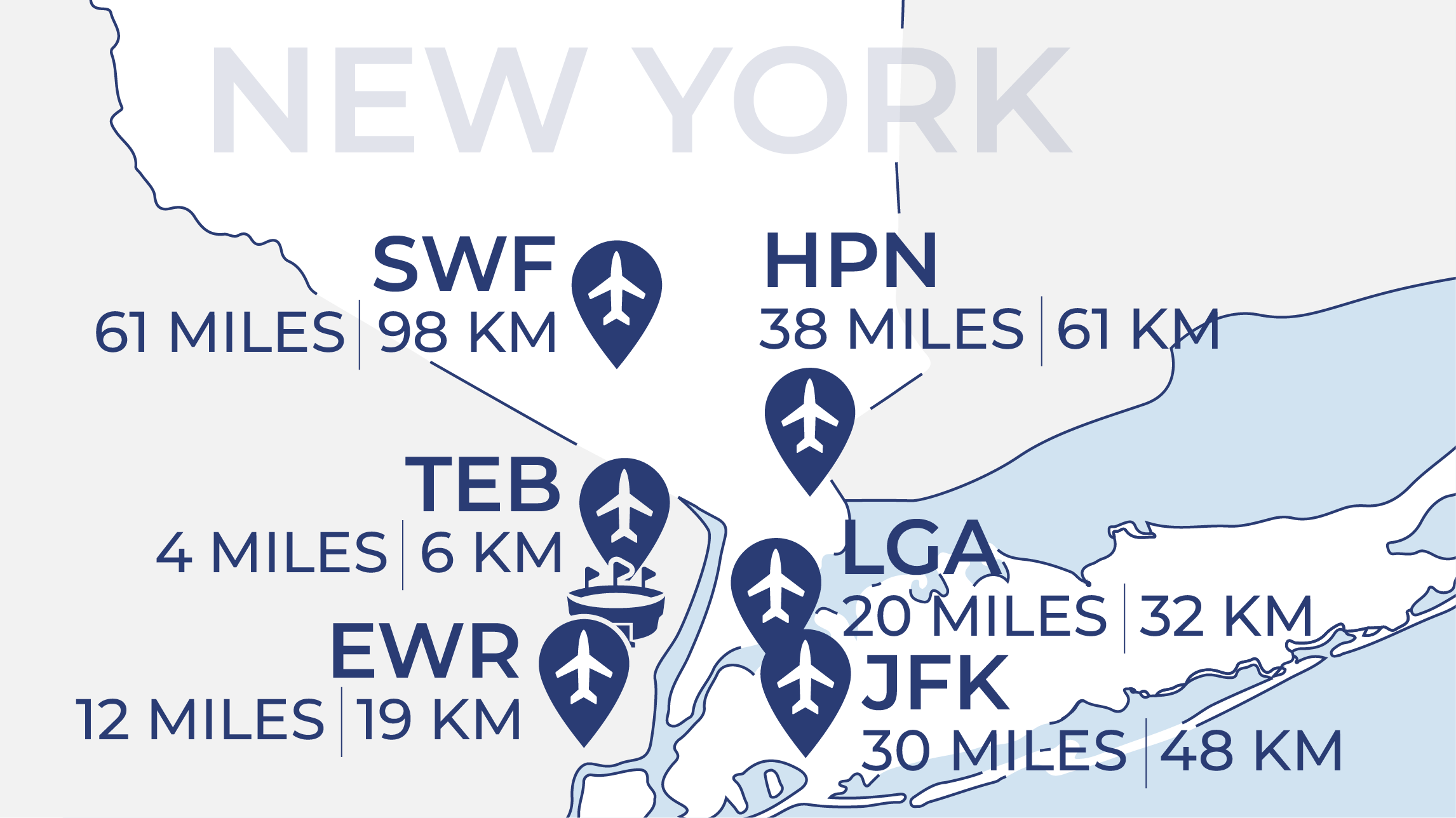 Located in New Windsor, about an hour north of New York City, SWF accommodates both commercial and private aviation. With its 11,800-foot runway, SWF easily handles large jets, international charters, and military operations. The airport operates 24/7 with U.S. Customs and Border Protection on site, making it suitable for international arrivals without diversion to larger NYC airports. While farther from the city and stadium than Teterboro, Stewart offers a less congested alternative with ample ramp space and lower operating costs for charter and private flights.